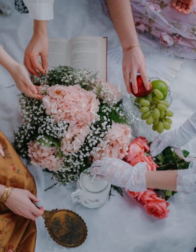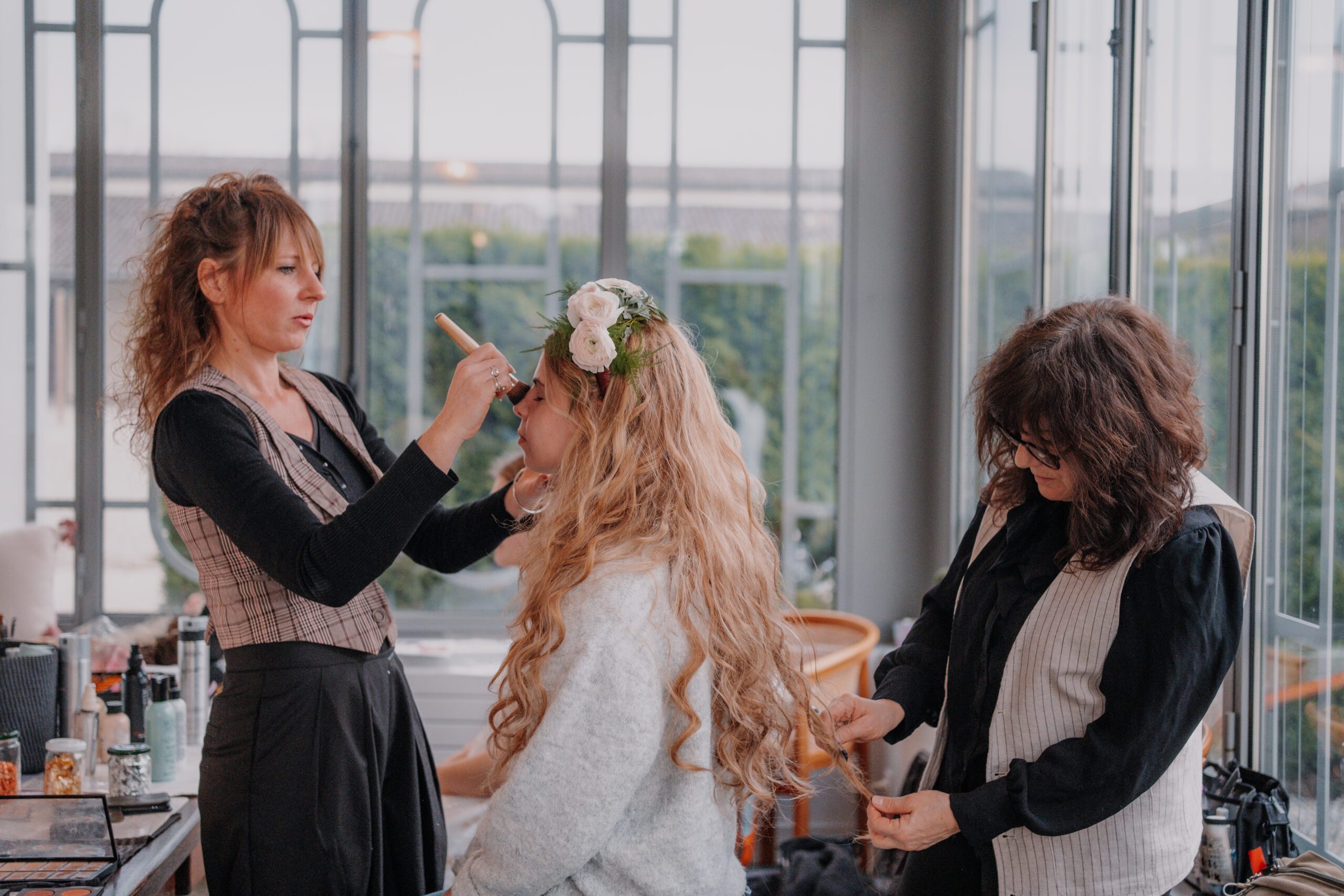 Après un petit déjeuner gourmand, vous passez entre les mains de nos expertes en images pour une mise en beauté coiffure et maquillage. Et bien sûr, vous choisissez vos plus belles robes pour la journée.
